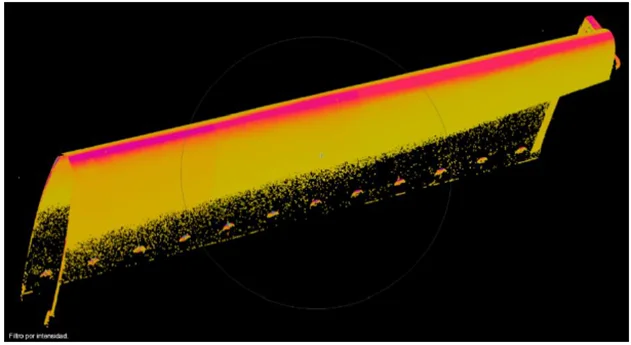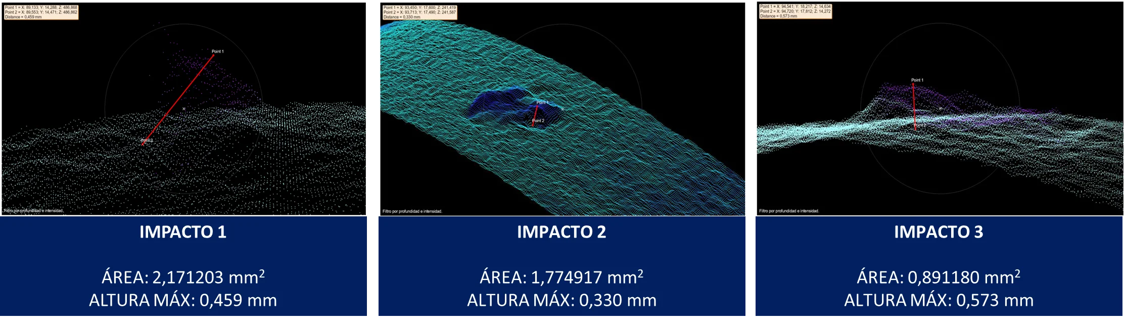 Se optó por escanear solo en las zonas donde ya se había detectado impacto, aumentando la densidad de puntos para obtener datos precisos. Con este método, se localizaron tres impactos en el demostrador, midiendo tanto el área como la altura de cada uno.