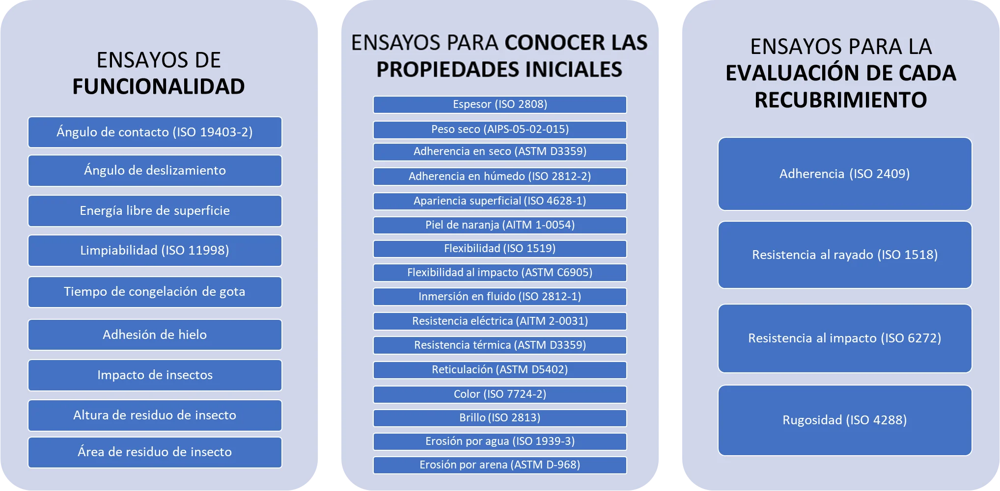 Para evaluar el rendimiento de los recubrimientos, se han llevado a cabo múltiples ensayos, tanto convencionales como desarrollados específicamente para este proyecto: