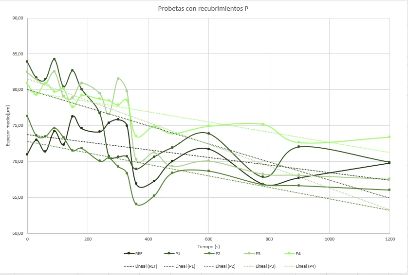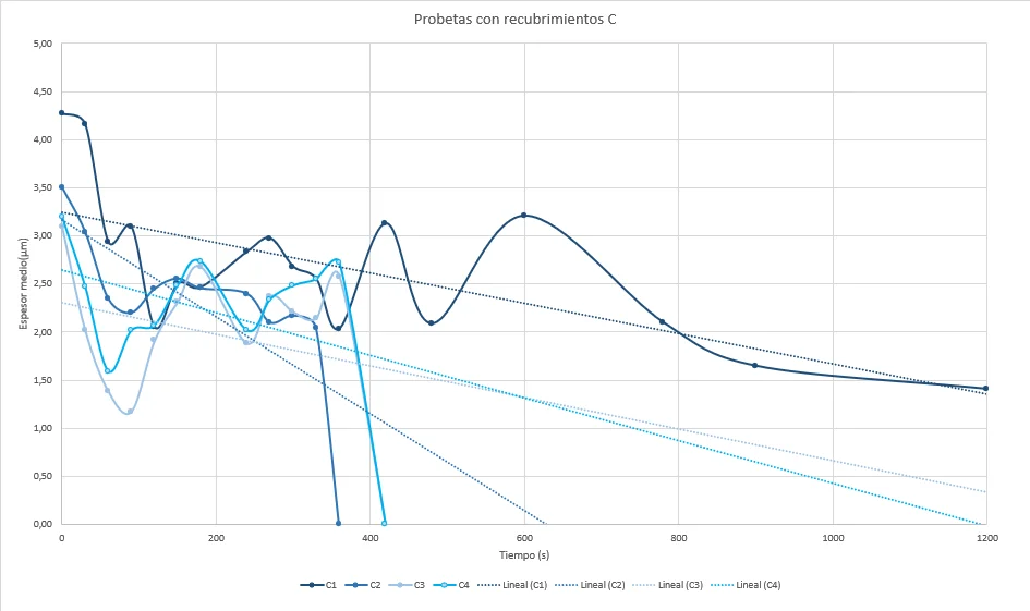 Se compararon los espesores antes y después del ensayo. El recubrimiento C1 destacó por su estabilidad, manteniendo su espesor, mientras que otros C se degradaron completamente. Los recubrimientos P, a pesar de su grosor, sufrieron pérdidas de hasta 3 µm con desgaste irregular.