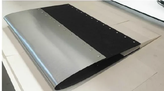 Se procedió entonces con la fabricación del demostrador final con geometría alar, de 600 mm de ancho. Este está compuesto por tres piezas diferentes unidas entre sí: un borde de ataque anodizado, que se remacha a paneles de fibra de carbono de mayor espesor, junto con una pieza de soporte fabricada en material plástico que permitiera su ensamblaje, también mediante remaches. La parte que realmente inspecciona es el borde de aluminio con el recubrimiento C1, que fue contaminada previamente con impacto de insectos.
