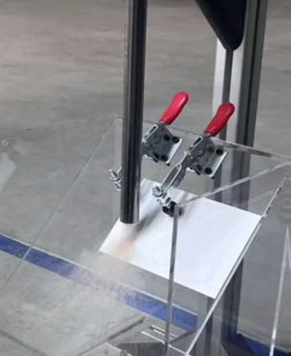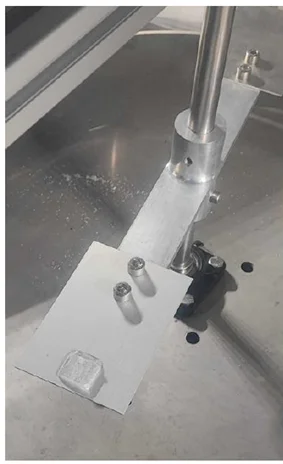 Se prepararon las probetas con una capa de hielo uniforme de 30 × 30 mm y una masa aproximada de 3 g, situada en el extremo opuesto a la fijación mecánica. Para garantizar condiciones estables durante el ensayo, todo el proceso se ha realizado en el interior de una cámara climática a -7ºC.
