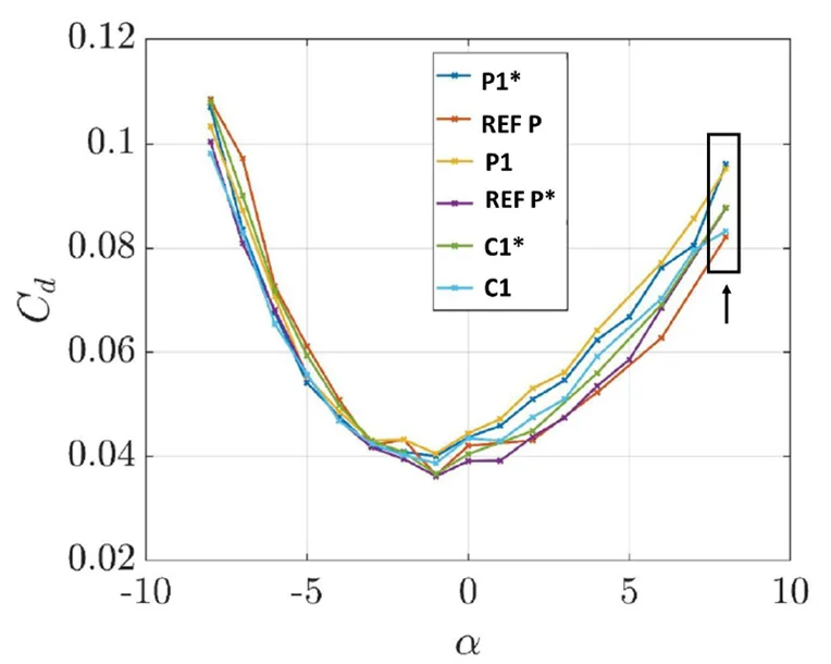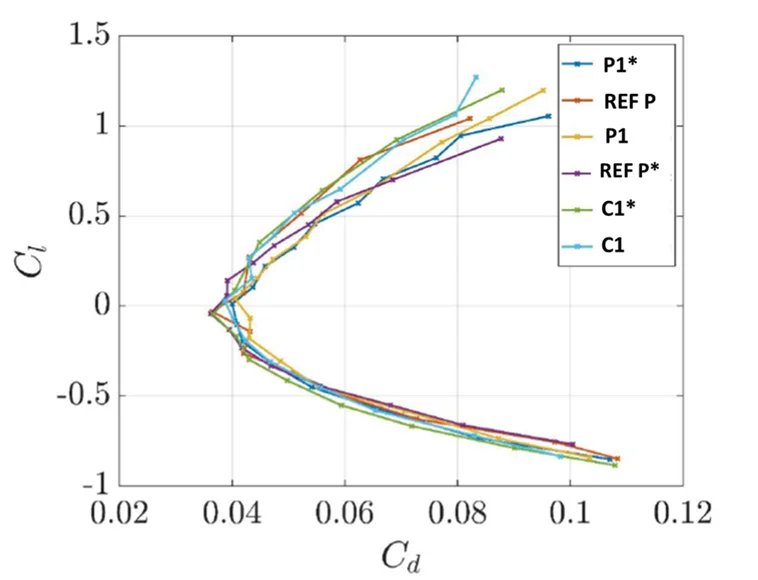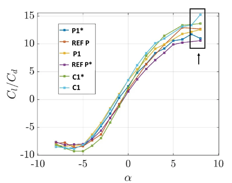 La eficiencia aerodinámica (Cl/Cd) fue mayor en los demostradores recubiertos con C1, tanto limpios como contaminados, especialmente a ángulos de ataque positivos. En segundo lugar se situó P1 sin contaminar, mientras que el resto mostró un rendimiento claramente inferior.