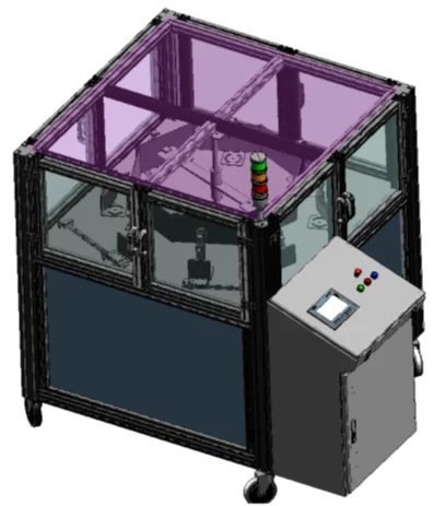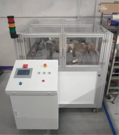 · Para llevar a cabo el ensayo de adhesión de hielo fue necesario el diseño y puesta a punto de una máquina centrífuga. Esta presenta unas dimensiones de 130 × 130 × 150 cm e incorpora un panel de control lateral. Está diseñado para alcanzar una velocidad máxima de rotación de 6000 rpm, y cuenta con un brazo rotatorio de 29 cm en el que se fijan las probetas mediante dos tornillos, junto con un contrapeso simétrico para equilibrar el sistema.