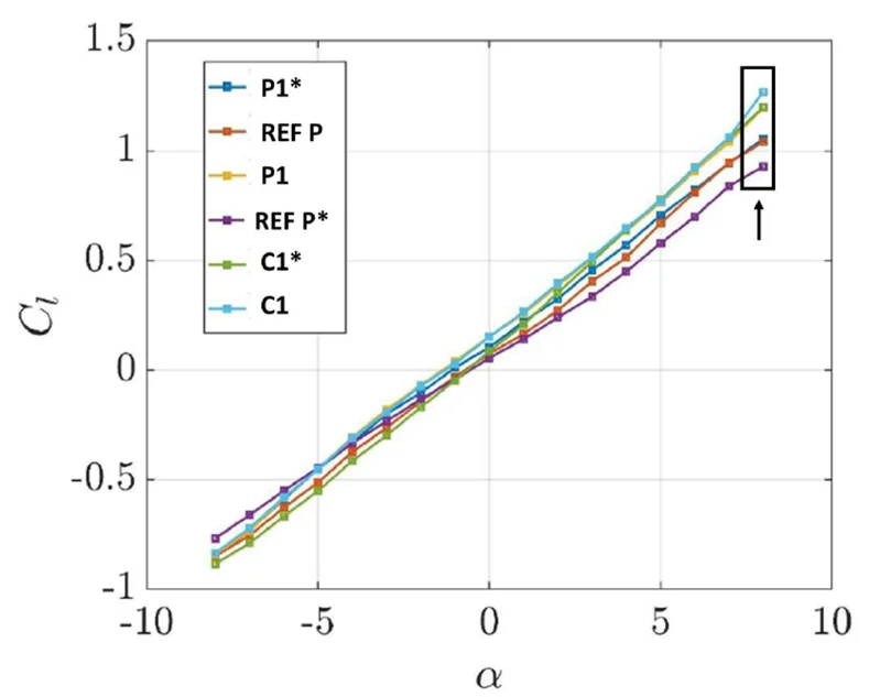 Los demostradores con recubrimientos C1 y P1 mostraron un buen rendimiento, destacando C1 por ofrecer una mayor sustentación (CI). Sin contaminar, C1 superó a P1 en más de un 6 %, y con contaminación de insectos, la ventaja de C1* frente a P1* fue cercana al 10 %, confirmando su mejor desempeño incluso en condiciones adversas.
