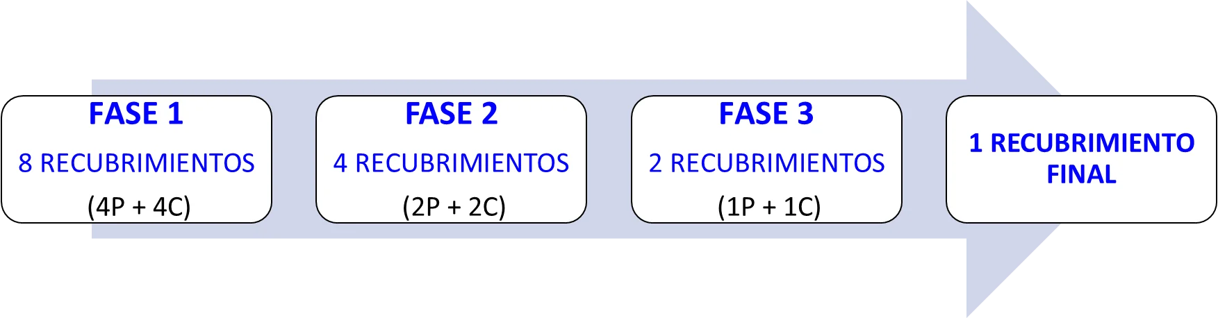 FASE 1: Se realizaron ensayos comparativos sobre los 8 recubrimientos de estudio: 4 de tipo C (C1, C2, C3 y C4) y 4 de tipo P (P1, P2, P3 y P4). A partir de los resultados obtenidos, se seleccionaron los 4 más prometedores, dos de cada tipo, para la siguiente fase.