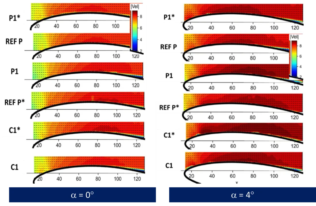 Se realizaron mediciones de visualización de flujo en los 6 demostradores a ángulos de ataque de 0° y 4°, obteniendo 200 pares de imágenes por caso. Las zonas rojas indican flujo rápido y eficiente, mientras que las regiones verdes o azules cerca del borde de ataque sugieren posibles pérdidas aerodinámicas.