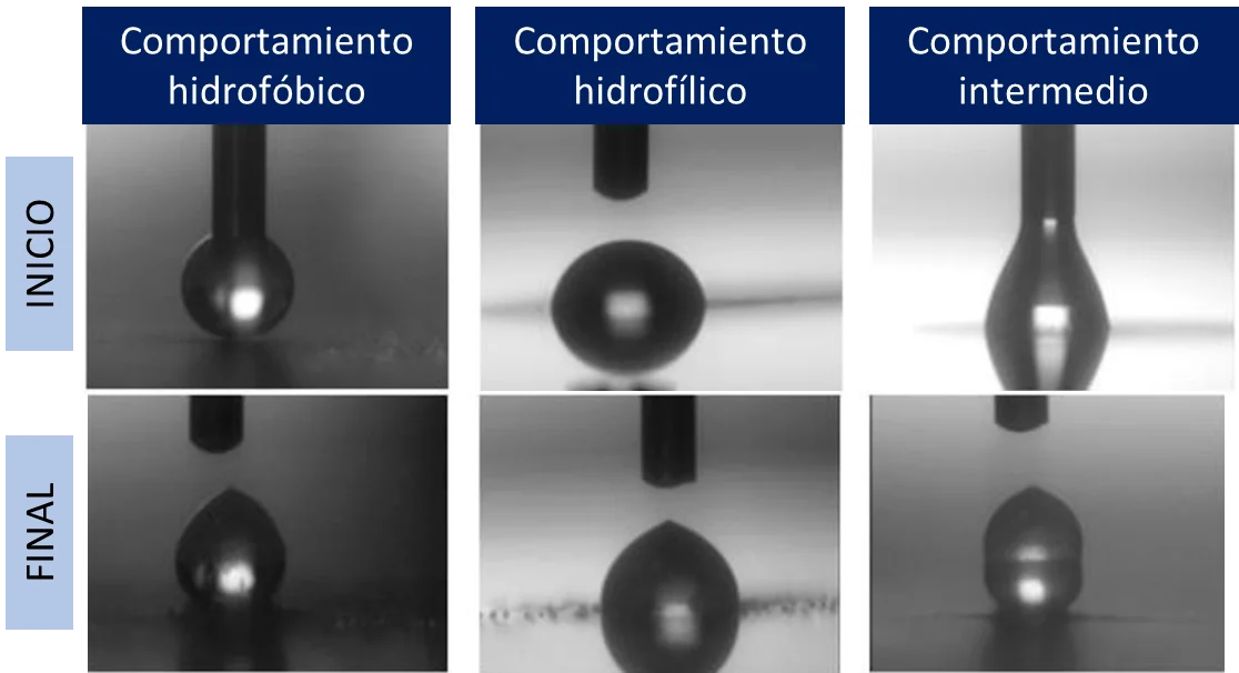 · En el ensayo de congelación de gota se evaluó el tiempo que tardó la gota en congelarse, así como su morfología al inicio y al final del proceso. Según esa forma, se puede considerar si el recubrimiento de estudio es más hidrofóbico, hidrofílico o tiene un comportamiento intermedio.